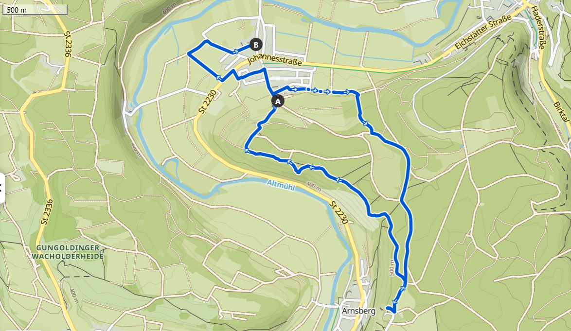 Die Wanderung findet im Bereich Böhming (Altmühltal, oberhalb Kipfenberg) statt, sie ist rund 6 km lang und führt ca. 140 Höhenmeter hoch zu Schloss und Burgruine Arnsberg.